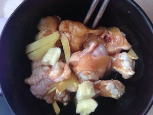 3、锅中放油,将葱姜蒜辣椒爆香,加入鸡块翻炒,加入盐,少许醋,糖适量(根据自己口味)酱油,料酒翻炒,加入冷水,将土豆放入,大火,等待煮滚后,小火炖