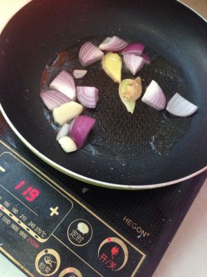 热锅下少许油 放洋葱生姜大蒜扁炒出香味