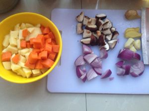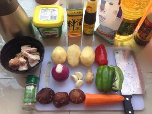 2、葱姜蒜分别切成片状,红色小米椒去子切成滚刀块,土豆切成滚刀块