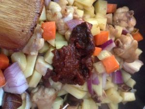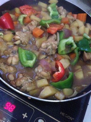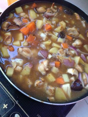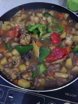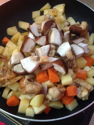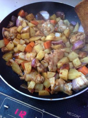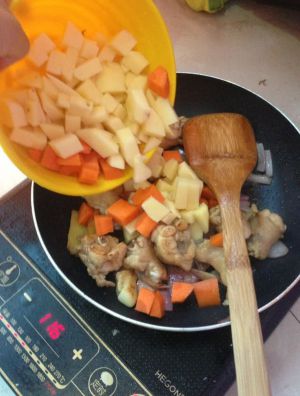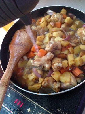 待鸡肉烧至8成熟,倒入土豆烧熟