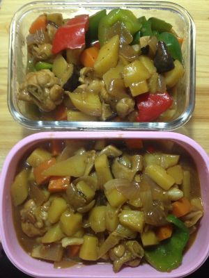 洋葱烧软后即可出锅,好吃的红烧土豆鸡块上桌了。