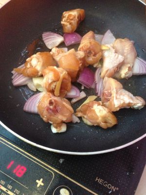 葱姜蒜炒出香味后倒入鸡块翻炒