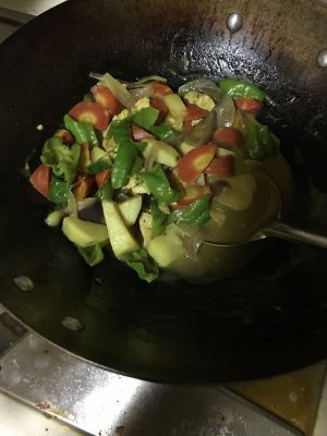 把土豆,胡萝卜,洋葱放进去,继续翻炒。倒入少量老抽