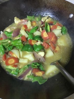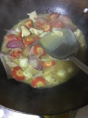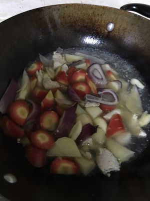 热锅倒少许油,下胡萝卜炒(胡萝卜脂溶性的可以多炒一会),然后下鸡块同炒,然后下土豆洋葱炒。