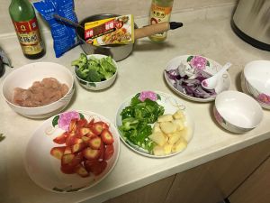 准备:土豆切块,胡萝卜切块或丁(按心情来),洋葱切片或丝(依然按心情),鸡腿买的时候让老板切好,肉食动物要多来点肉。