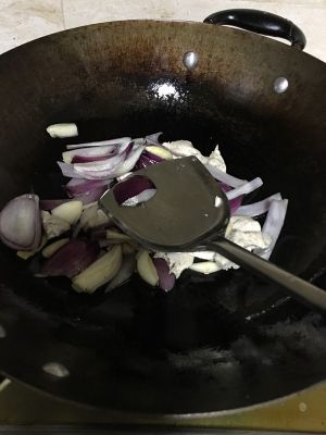 小火把少量油烧六成熟,刚冒气时,把切好的大块蒜和细条状姜放入油中,然后紧接着,倒入切好的洋葱,我在这块失误了,炒了二分钟,洋葱倒入,紧接着倒入腌制好的鸡脯,搅拌,半分钟后放入胡萝卜,土豆最好过热水一分钟此时放入。