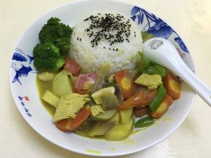 在小碗放入少量熟黑芝麻,把米饭盛满,倒扣到大碟子,然后放入咖喱菜等,最后把过水煮过三分钟左右的西兰花摆上。一道菜就做好了。第一次做这个,失误成了经验,快乐更多些。哈哈