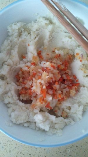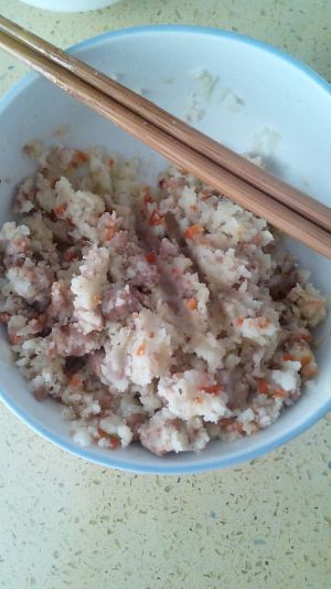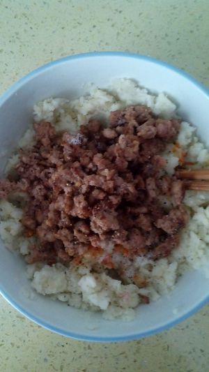 土豆切小方块,用盐水浸泡10分钟后,隔水蒸15-20分钟,至土豆完全熟透,一捏就碎,晾干一会儿,再转移到盘子里,加入适量的盐、胡椒粉,压成土豆泥。 把土豆泥,刚刚炒好的肉料混合均匀。