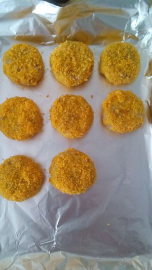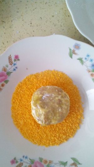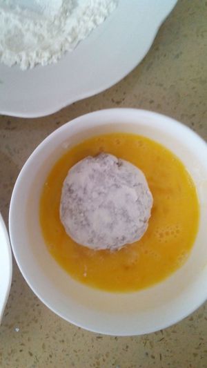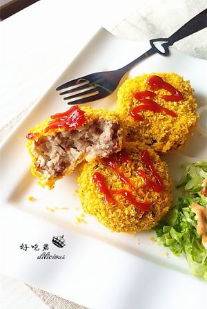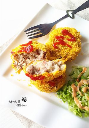 搅拌均匀的面糊捏成团,分成6份,捏成小圆饼。依次裹上淀粉,鸡蛋液,面包糠。