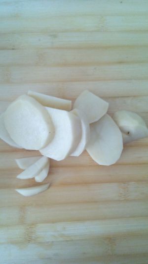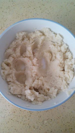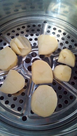 土豆切片加入适量盐放蒸锅蒸,蒸到土豆熟透后碾至成泥,这里土豆我是用了两个中等大小的土豆来做的