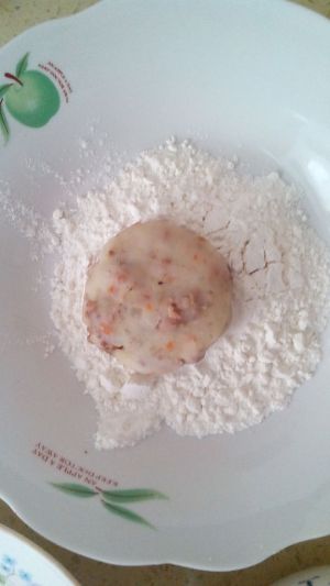 拿一小块儿土豆泥捏成圆饼状,裹一层面粉。