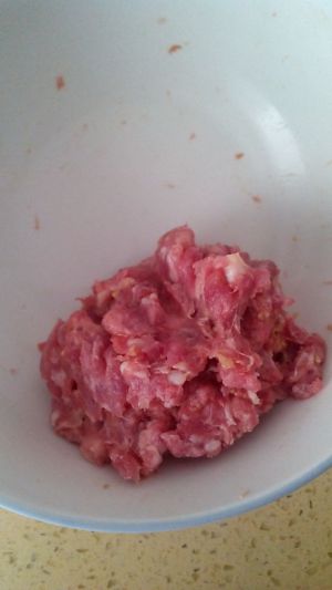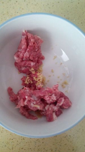 肉馅儿中放入少许的料酒、2g的食盐和生姜末。