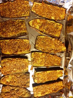 将蒸好的茄子在烤盘上摆好[水份多的话,就挤下来一些],将调好的汁铺在茄子表面。然后上烤箱温度210度,时间10分钟