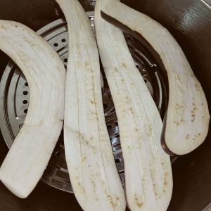 茄子对半切开,竖着划几刀,不要切断了,然后放入蒸锅蒸十分钟,这样茄子很软,多汁