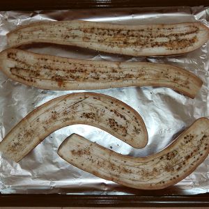 蒸好的茄子放入铺了锡纸的烤盘里,表面刷一层油,然后撒点椒盐和孜然粒。