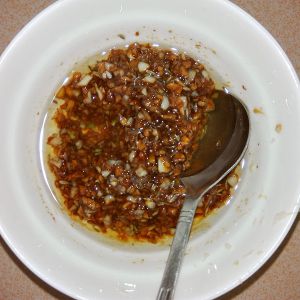 大蒜切沫,加入辣椒酱,橄榄油,黑胡椒,少许糖