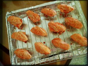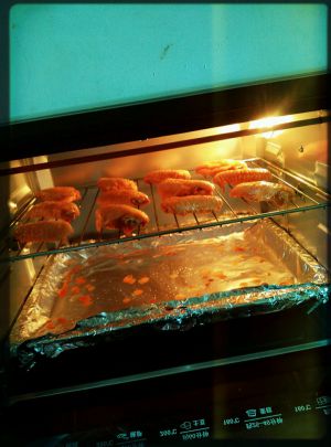 烤箱首先要调至210度左右预热10分钟,然后再将烤盘放在最下层,烤网放在中层~(鸡翅直接放在烤盘上的锡箔纸上烤也可以,但是我觉得肉类放在烤网上烤出来口感比较好)上下管调至220度,烤15分钟拿出,可以把剩余的腌料水轻轻刷在鸡翅上,把鸡翅翻面后然后再烤15分钟~