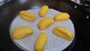 锅里加入少量的油待油热后,把馒头放在鸡蛋里沾一下(两面都要沾哦)两面煎至金黄后出锅。