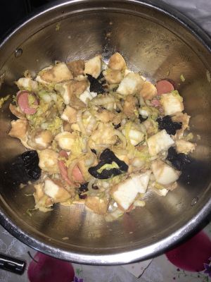 白菜至七成熟后放入木耳,火腿肠,番茄酱,盐适量