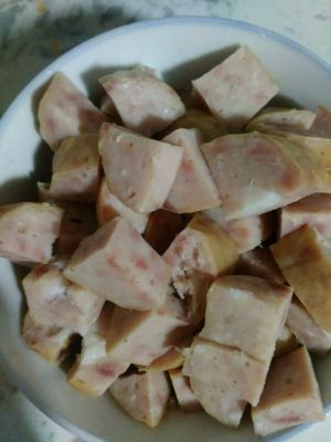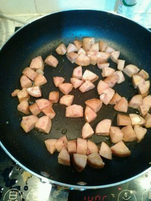 重新倒油,把香肠倒入锅中翻炒至微微焦黄。