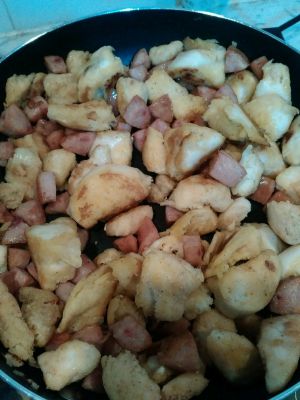 倒入刚才煎好的馒头块一起翻炒一会,盛出即可。