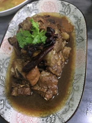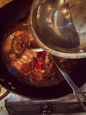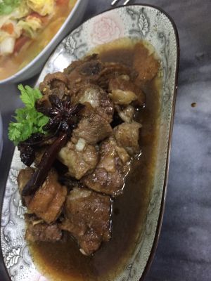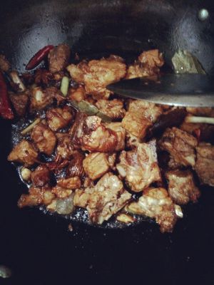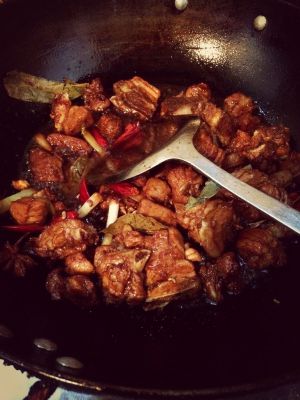 锅里倒入一点油。小火熬冰糖,至冰糖变褐色时,将排骨倒入翻炒,倒入少许老抽调色调味,加水继续炖煮,排骨入色入味后即可出锅。