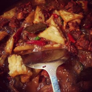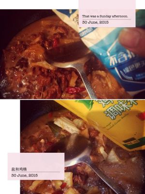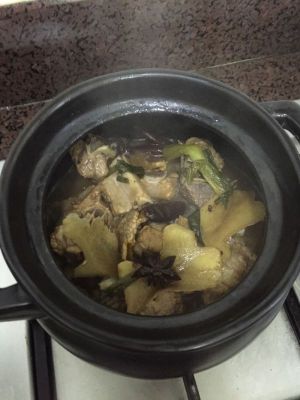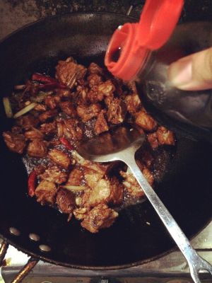 炖至汤汁为原来的三分之一时,加入老抽提色。翻炒一下,加入味精,再翻炒一下,关火。