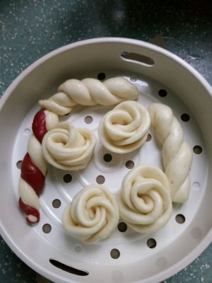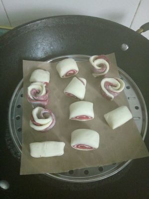 把切好的面团立起,玫瑰花型紫薯馒头胚就做好了。