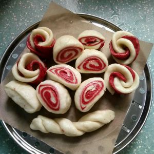 把白面分成一大一小两块,大面团和菠菜面分别擀成长方形。叠加后卷成卷儿。注意要卷得紧一些。