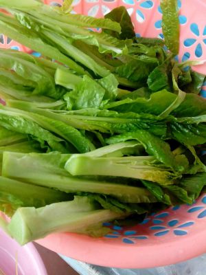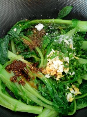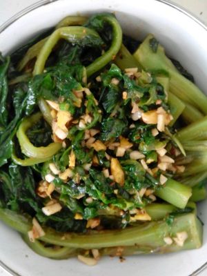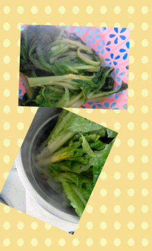然后烧水。水开了。注意。这个时候先把头子放下去煮。叶子比较快就熟了。所以先煮下头子。然后差不多颜色变了就捞起来。这个吃生脆点安逸些。