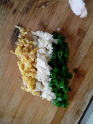 然后准备香料。小香葱切碎。生姜大蒜拍了切碎。如果喜欢辣。可以切两个小米椒。
