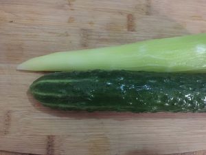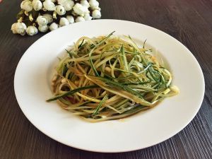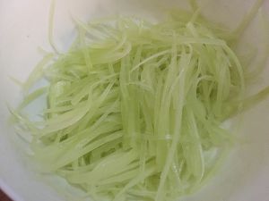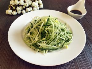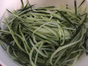 黄瓜也擦成比较长的细丝,黄瓜心不要擦进去,直接吃味道更佳。