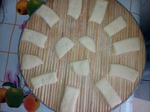 把面团从中间切开,按扁后,均匀的切成长方行的,