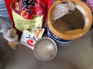 玉米粉用开水糊开,孝粉用温水糊开,除了红枣不到里面,其它都到里面,还可以加面粉