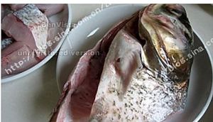 鱼头内部抹上少许盐,可以让内部的鱼肉有底味。