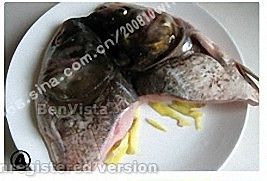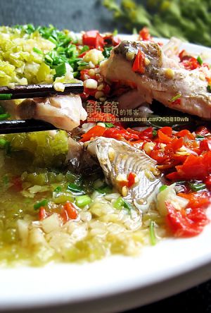 第二,葱丝,姜丝,都放盘里把切好的鱼头摆在上面,在把蒸鱼豉油淋在上面,再把剁椒酱涂在鱼头上面,然后上锅蒸20分钟(可根据鱼头大小来设定时间。)
