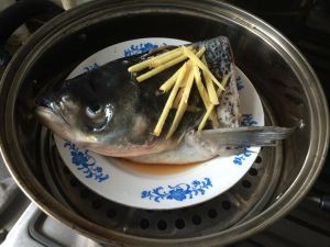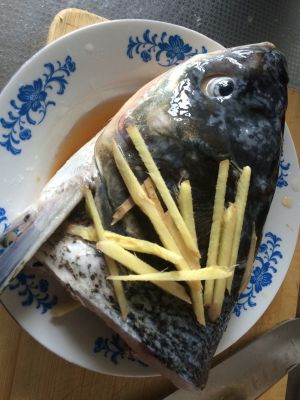 沥干水的鱼头架在碟子上,在鱼头上摆上几片姜,可以随自己喜好。淋上一些料酒