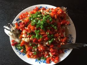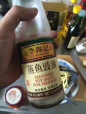 再蒸八分钟出锅。放入香葱碎,浇上李锦记的蒸鱼豉油,在烧一勺热油浇在上面,呲啦呲啦的就好啦。