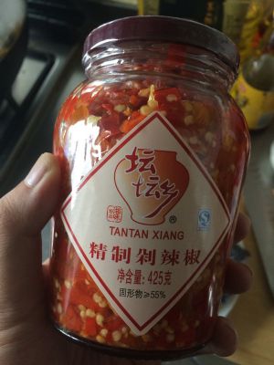 辣椒酱加入一部分姜碎,加入一些切碎的葱白部分(可以换大蒜头)加入少许胡椒粉(个人喜好,可以不加)加入适量生抽,大概两三汤勺拌匀