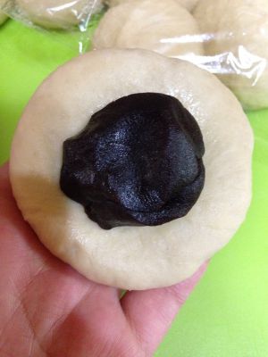 取一个小面团压扁,包入25g豆沙馅,捏紧