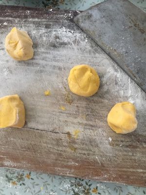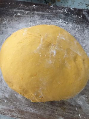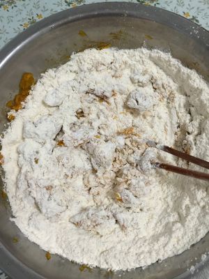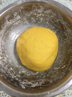 等南瓜凉一凉 不烫手的时候 加入酵母和面粉 筷子搅成絮或块状