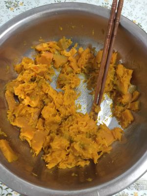 蒸好的南瓜 倒出盘中的水 放一边 南瓜弄成南瓜泥