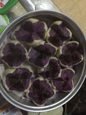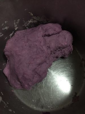 紫薯上锅蒸熟,剥皮,捏碎,加入面粉,酵母粉,一起揉成紫色的面团