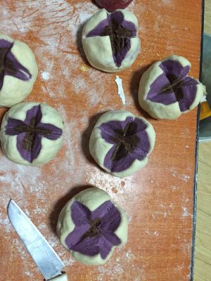 手上沾干粉,先把三色面团分别搓成条,切成剂子,用紫薯面团包入巧克力面团,最后在用白色的面团包入紫薯面团,捏口朝下,用小刀在馒头上划个十字,一定要划到能看到巧克力面团