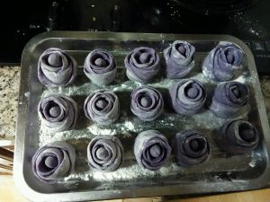 两个面团分别搓成团压扁,然后上下叠在一起用擀面杖擀开撒上芝麻 然后卷起来 用刀切开。
