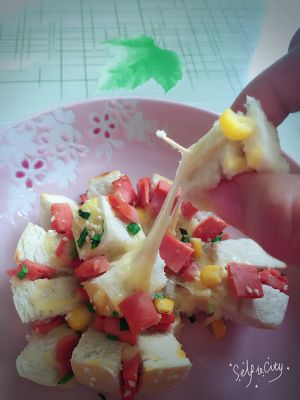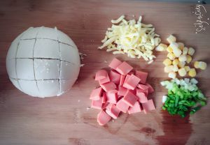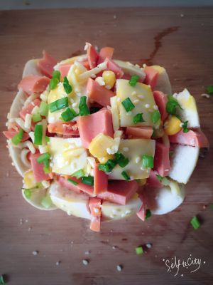 依次放入芝士碎、火腿、玉米粒、撒些盐,刷一层蛋液,撒芝麻和小葱。