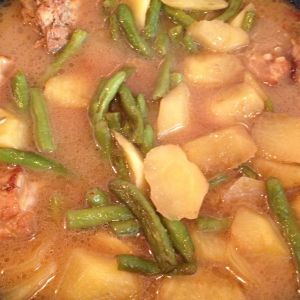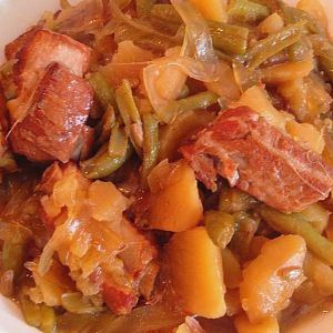 炖1小时后放入土豆和扁豆一起再盖锅盖慢炖半小时。这时尝尝味道如果不够咸可以加些盐来调味道(根据个人口味)
