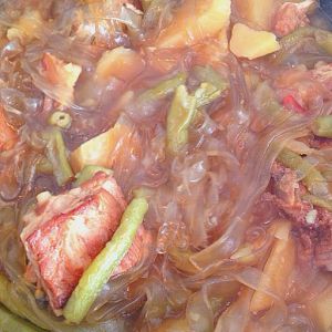 最后开盖铺上泡软的粉条再炖15至20分钟(注意粉条不要把汤汁吸干拉)汤汁如果少可以再加些水炖制。待粉条透明劲道即可出锅啦。