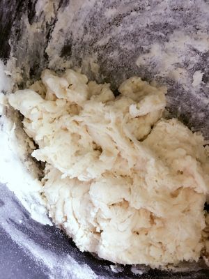 搅拌成都是柳絮状,就可以洗干净小手准备揉面了。(用筷子多搅一会儿哦,一会儿和面就会很省力气。)