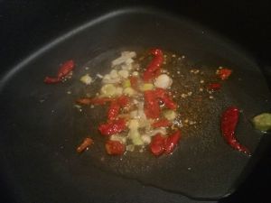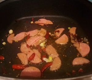 锅中加入植物油,油热后把葱姜干辣椒倒入炒出香味儿